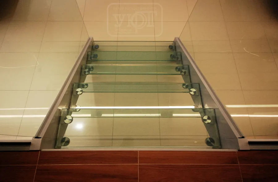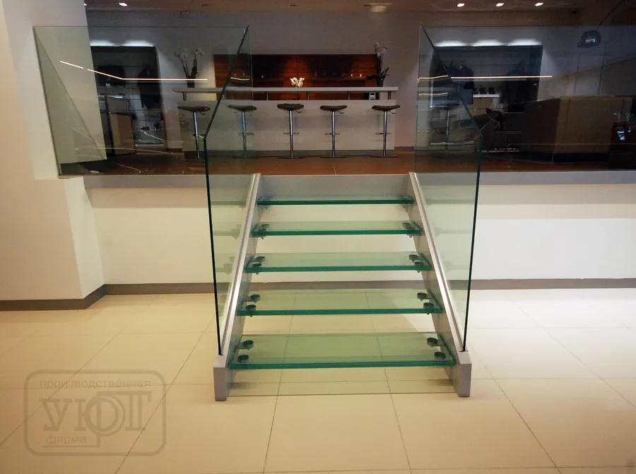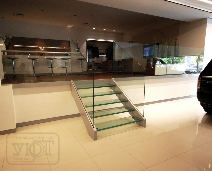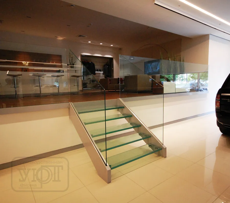 ЛЕСТНИЦА НА МЕТАЛЛОКАРКАСЕ. СТЕКЛЯННЫЕ СТУПЕНИ + СТЕКЛЯННОЕ ОГРАЖДЕНИЕ. АВТОСАЛОН. г. челябинск