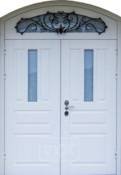 - Наружная отделка: Филёнчатая накладка МДФ 20 мм (покрытие водной эмалью, цвет по каталогу RAL на выбор). Двухкамерные стеклопакеты. Кованая решётка на верхней фрамуге. Наличники - МДФ.