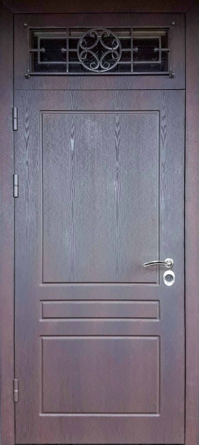 Наружная отделка: МДФ 16 мм + шпон дуба (покрытие маслом), цвет на выбор. 2-х камерный стеклопакет, кованая решётка (квадрат 12 мм).