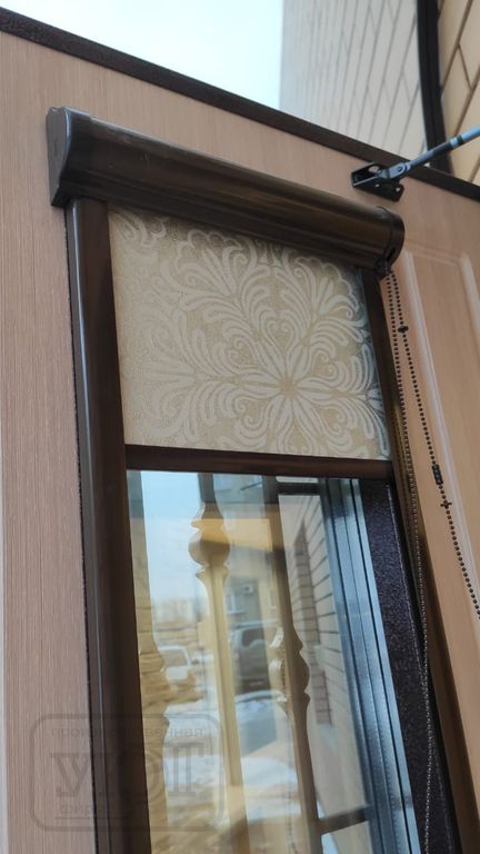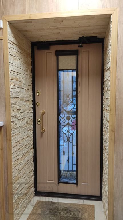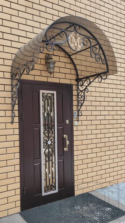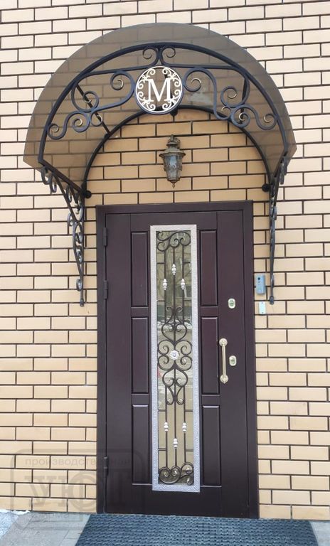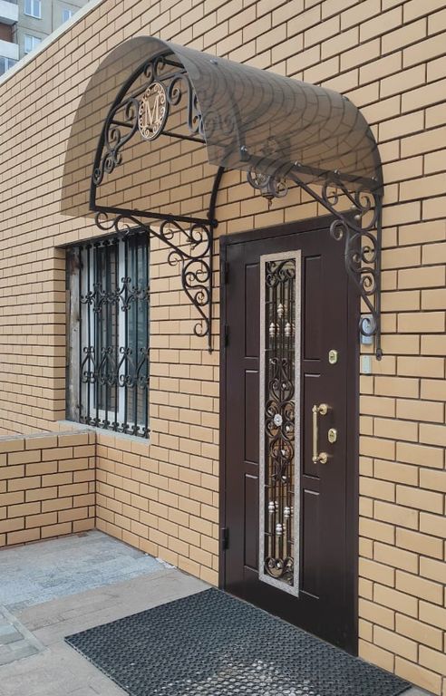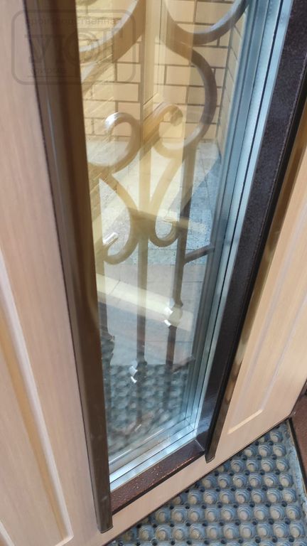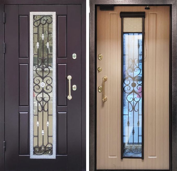 - Наружная отделка: Профильная конструкция (ППП, цвет - RAL 8019, шагрень). Стеклопакет с кованой решёткой, нанесение - патина. Декоративная рама. Тонировка стеклопакета: STP 50 NC SR PS (нейтральная светлая).