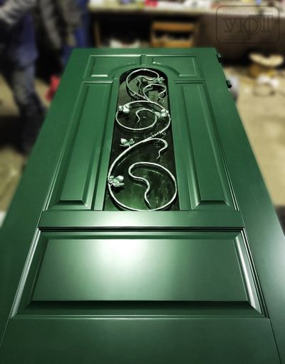 - Наружная отделка: стальной лист 2 мм - полимерно порошковое покрытие. Филёнчатая накладка МДФ 20 мм (покрытие водной эмалью); двухкамерный стеклопакет + кованая решётка. Наличники - МДФ.