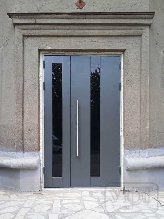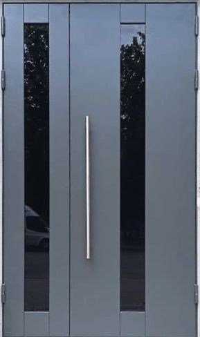 - Наружная отделка: стальной лист 2 мм - полимерно порошковое покрытие, цвет: RAL 7043 - мелкая шагрень. Профильная конструкция; стеклопакет с тонировкой (2 шт).