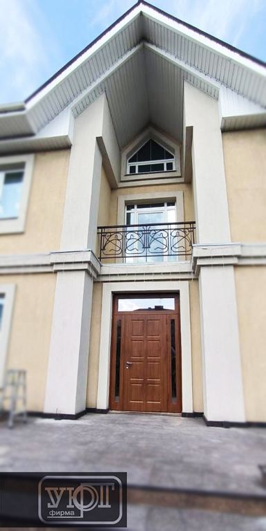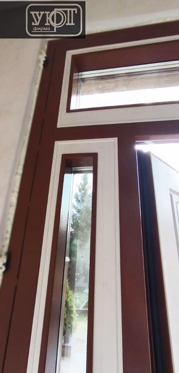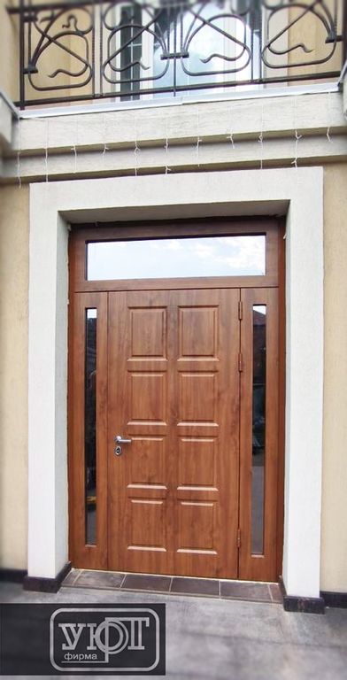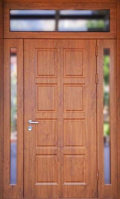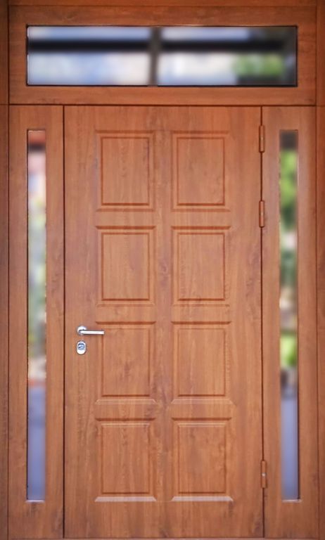 - Наружная отделка: Фрезерованные накладки МДФ 16 мм + плёнка ПВХ "Vinorit", цвет Golden OAK. На стальном листе 2 мм (полимерно порошковое покрытие, цвет RAL 8003, шагрень). Стеклопакеты в боковых фрамугах 1900х100, в верхней фрамуге 1400х320. Наличник МДФ.