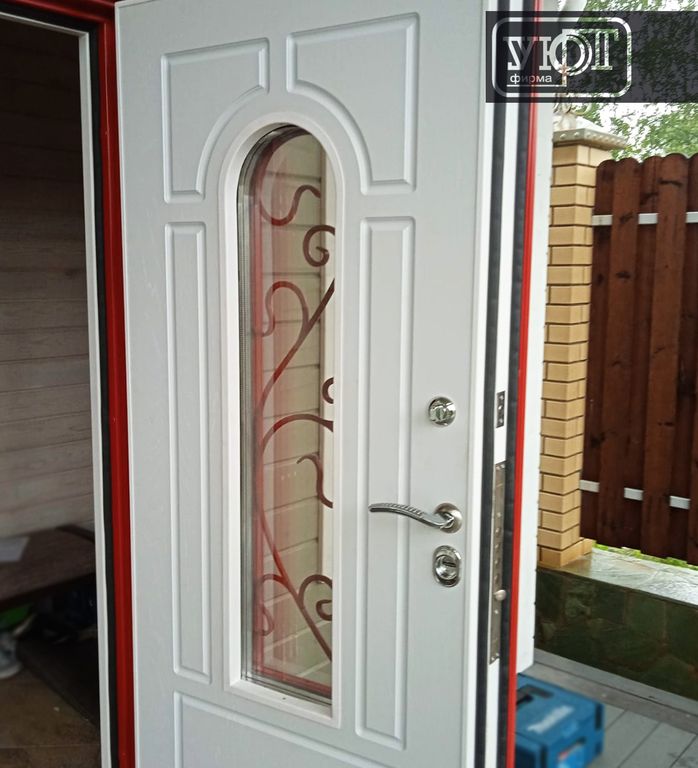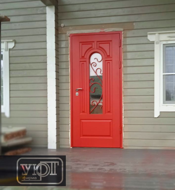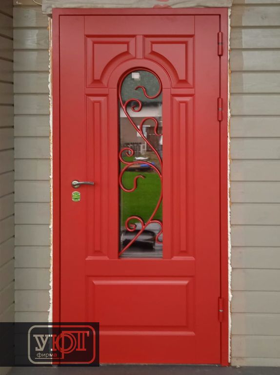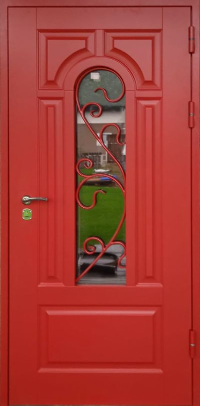 МДФ 20 мм с объёмной филёнкой, цвет RAL 3001 на стальном листе. Стеклопакет с тонировкой: 1120х250 мм. Наличник 70 мм (сталь).